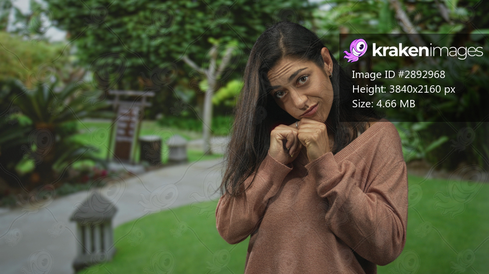 Woman clasping hands to chin on a forest path in a park, winking and tilting head; skeptical playfulness.