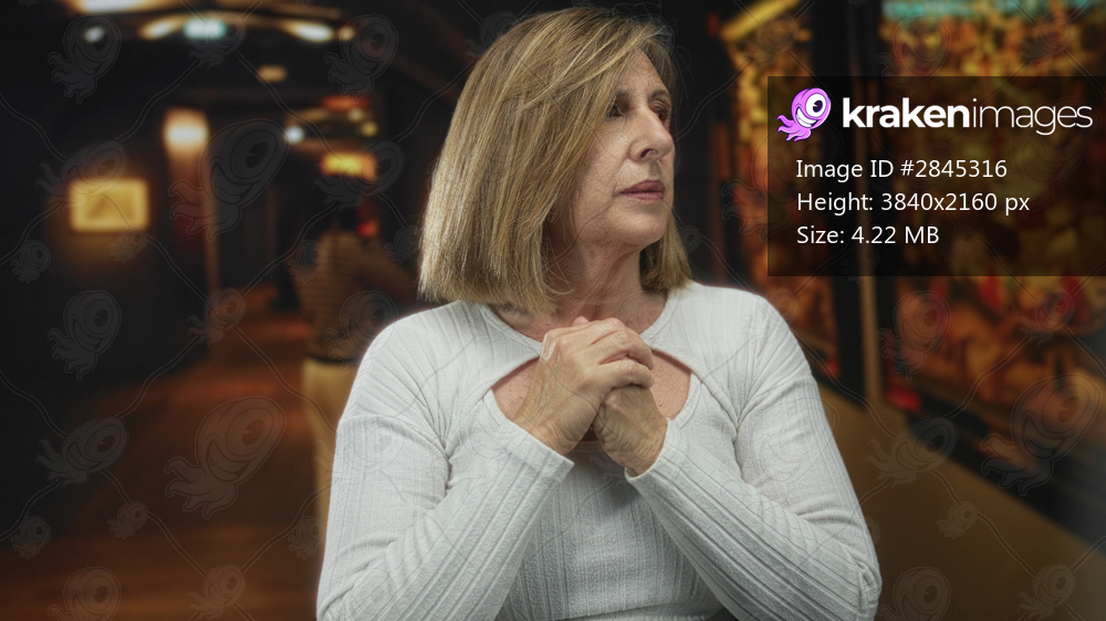 Woman clasping her bare hands to chest amid colorful modern paintings on gallery wall in art gallery building; serenity.