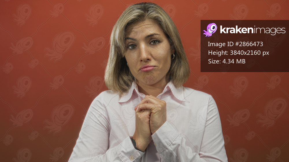 Woman clasps hands in studio under vibrant orange backdrop, wearing a crisp white shirt and silver hoop earrings, portrait closeup; doubt.