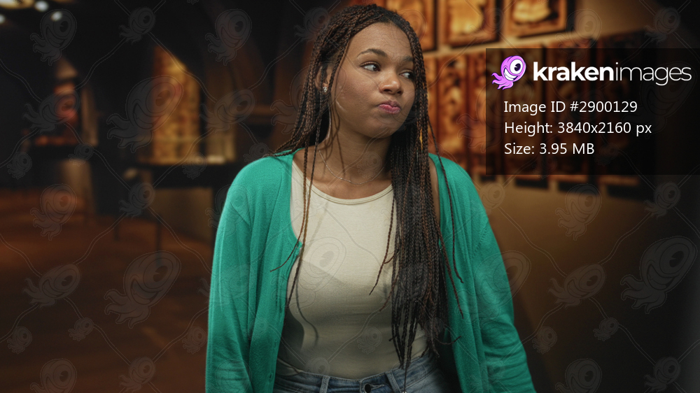 Woman clasps hands under chin inside building near framed art, braided hair, green cardigan and jeans, pursed lips and tense expression; quiet anxiety. - Kraken Images