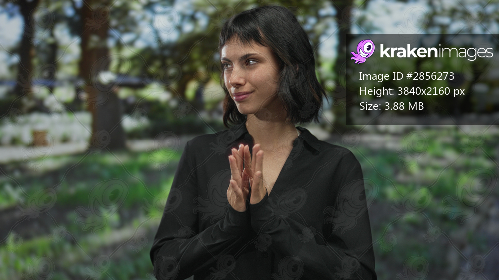 Woman clasps her hands and presses fingertips together in a forest clearing with green foliage and soft sunlight around her; calm contemplation.