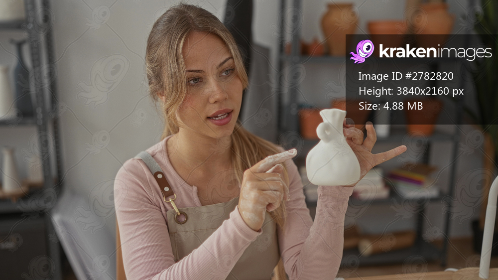 Woman with clay covered hands points finger to ceramic vase in pottery studio; creativity focus craftsmanship.