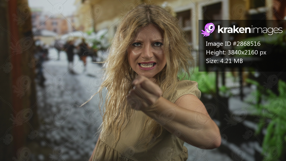 Woman with clenched fist pointing toward camera on cobblestone street, arm bare and aggressive gesture; anger defiance.