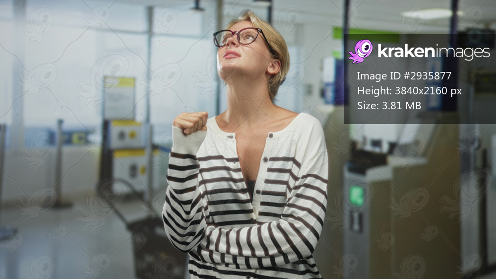 Woman with clenched fist to chest and crossed arms wearing glasses and striped cardigan at airport self service check in kiosk; relief travel readiness. - Kraken Images