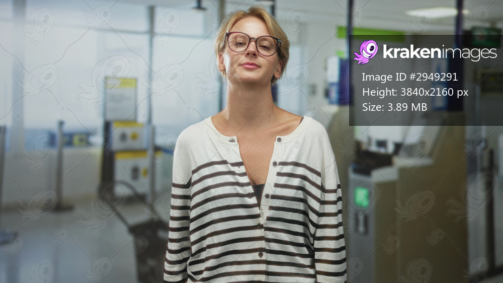 Woman with clenched fist to chest and crossed arms wearing glasses and striped cardigan at airport self service check in kiosk; relief travel readiness. - Kraken Images