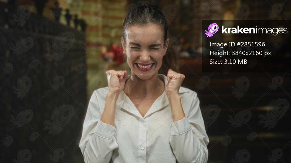 Woman with clenched fists and beaming smile stands in ornate church interior with wooden pews and stone columns; spiritual joy.