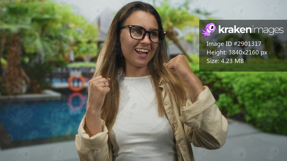 Woman with clenched fists and glasses standing by hotel pool on resort walkway making a celebratory fist pump and smiling; confidence.