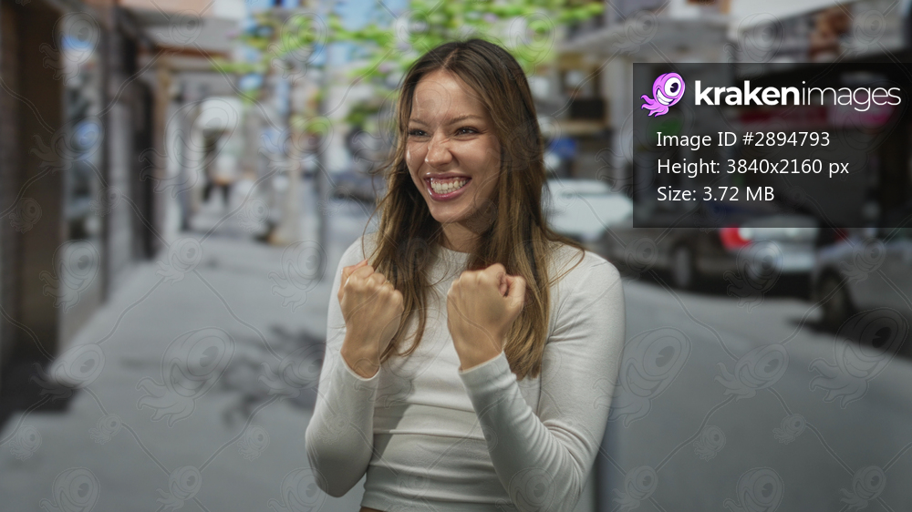 Woman with clenched fists and head thrown back on a busy street, laughing and cheering with hands raised and clenched; triumph celebration.