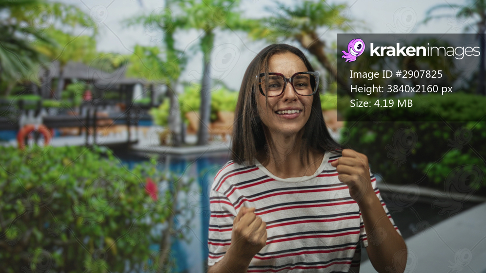 Woman with clenched fists punching forward and cheering by resort pool in striped tee and glasses; joy celebration.