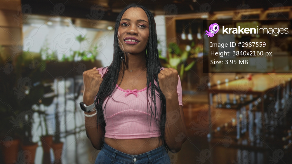 Woman with clenched fists and smartwatch in a building cafe, smiling and showing midriff; joy celebration hope.