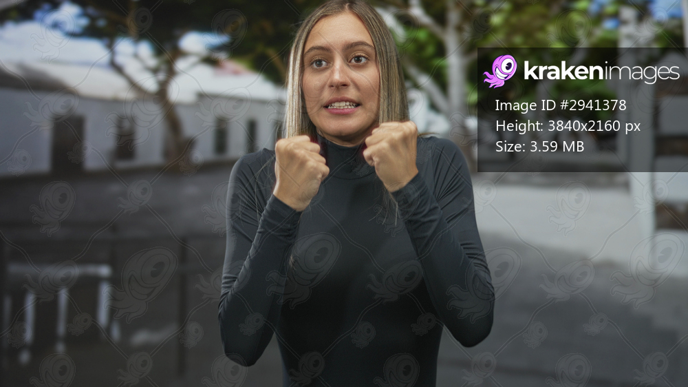 Woman with clenched fists and smiling face on a street plaza, hands raised in a victory gesture near white buildings and trees; victory celebration joy. - Kraken Images