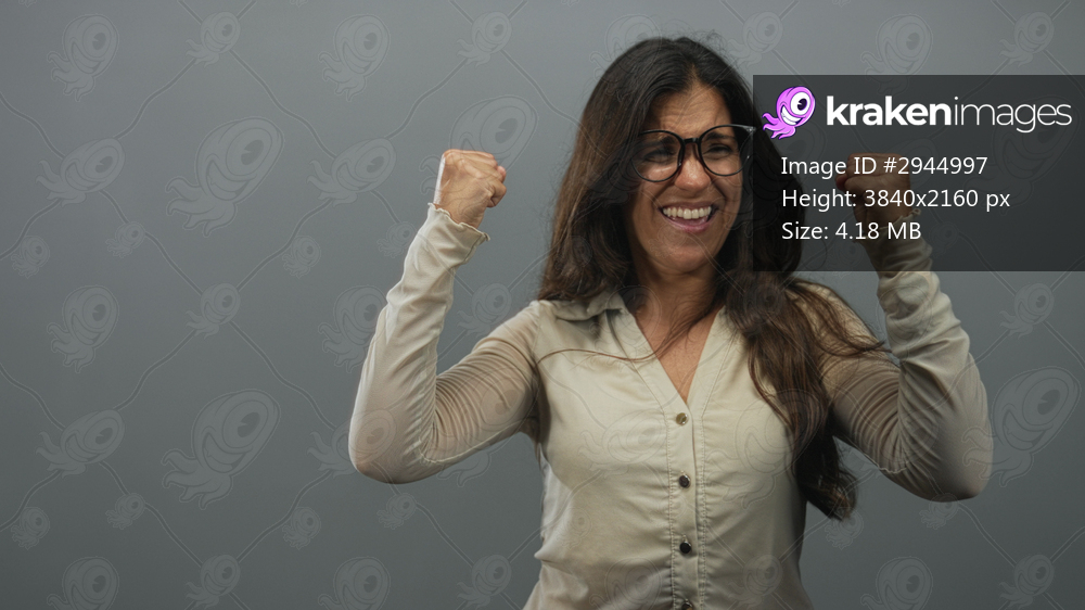 Woman with clenched fists and smiling face wearing glasses and beige shirt in studio gray backdrop; triumph.