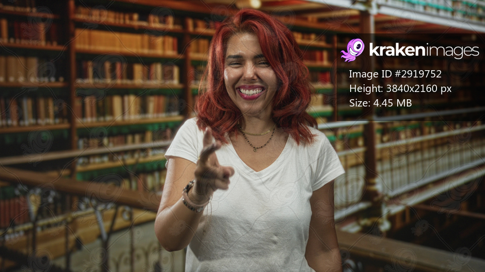 Woman with clenched fists smiling in library among tall bookshelves and railing; joy achievement success study.