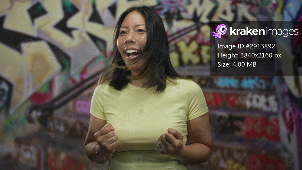 Woman with clenched fists smiling on a city street in front of graffiti covered stairs and metal railing; joy empowerment.