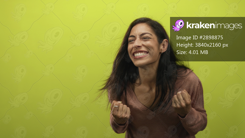 Woman with clenched fists smiling and shouting in a studio set with a lime green wall; pure excitement.
