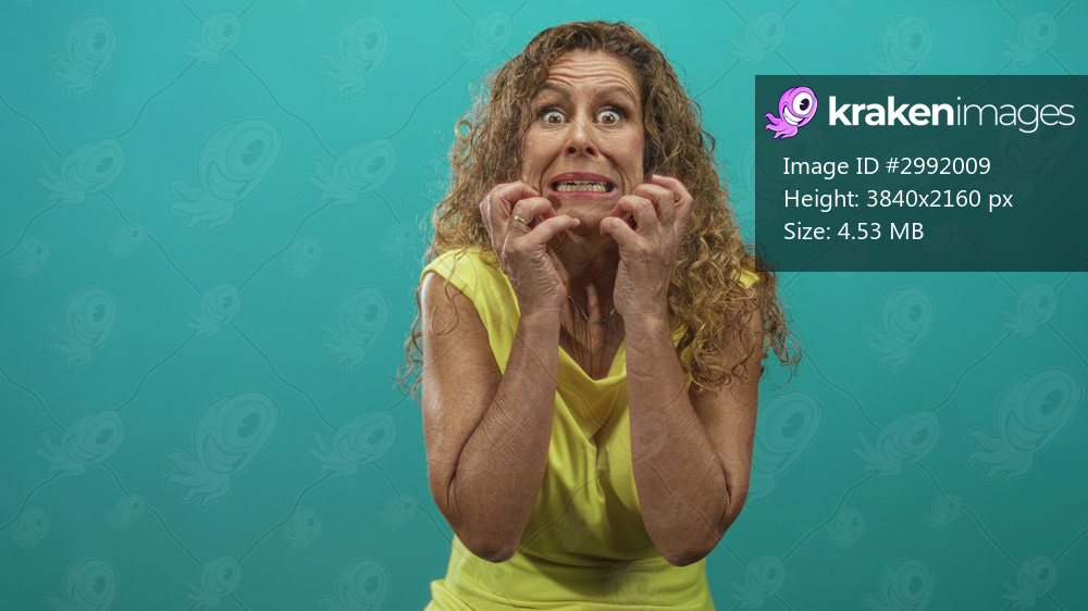 Woman with clenched hands and closed eyes making pleading gesture against teal studio backdrop; anxiety pleading.
