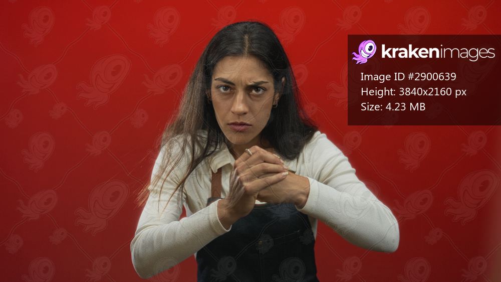 Woman with clenched hands and stern expression making a forward strike gesture in a red studio; anger determination.