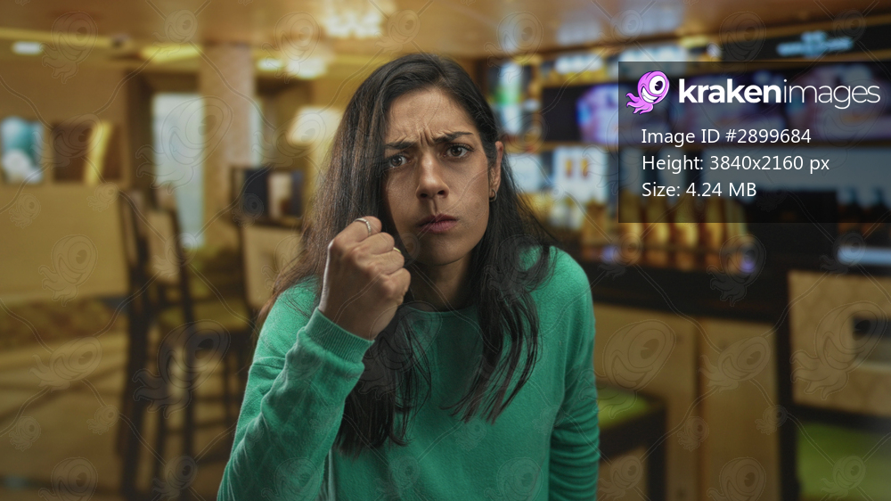 Woman clenches fist and glares in a restaurant building with raised hand near face and furrowed brow, leaning forward in an aggressive stance; anger confrontation. - Kraken Images