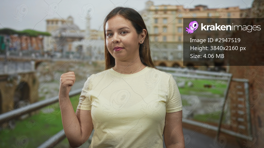 Woman clenches fist in front of roman ruins building on stone walkway by railing near ancient arches; reflection calm.