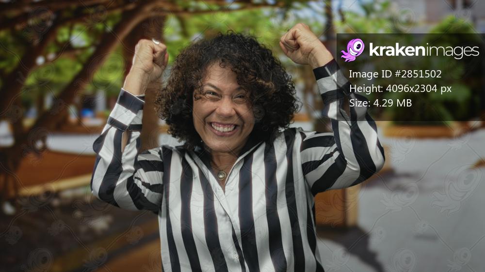 Woman clenches fists in green park under sunlight amid trees; victory empowerment success confidence.