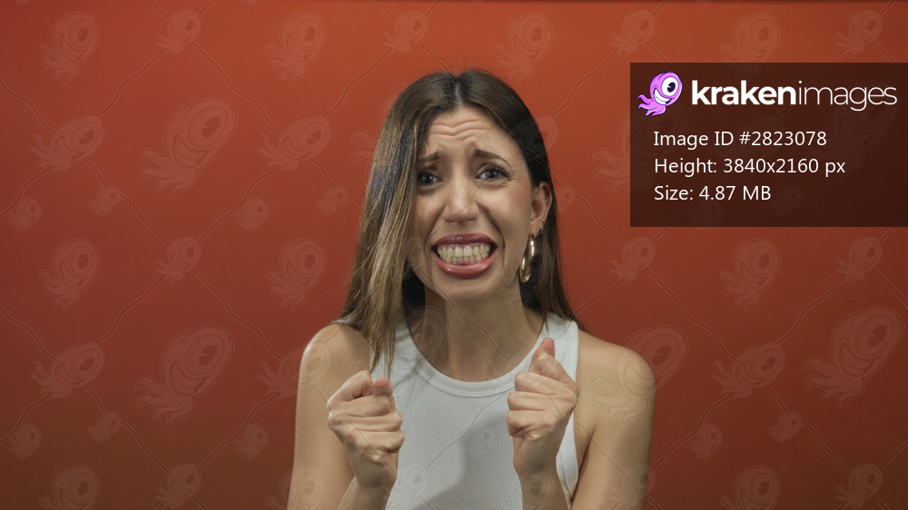 Woman clenches fists in orange studio lighting, eyebrows furrowed, jaws clenched, shoulders raised and lips parted; anxiety.