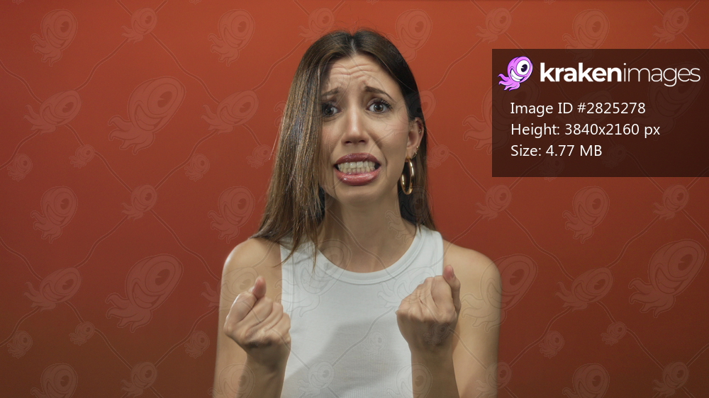 Woman clenches fists in orange studio lighting, eyebrows furrowed, jaws clenched, shoulders raised and lips parted; anxiety.