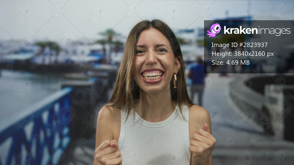 Woman clenches fists near blue railing at a vibrant seaside promenade under warm sunlight with palm trees and blurred boardwalk glimpses; joy happiness delight bliss - Kraken Images