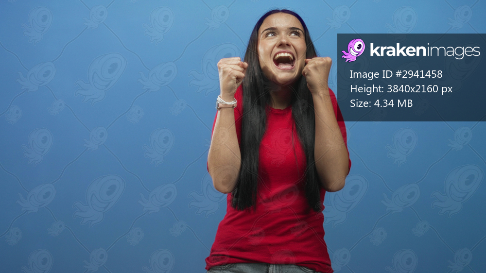 Woman clenches fists and smiles broadly in a studio blue set wearing a red shirt, hands raised in celebratory pose; excitement.
