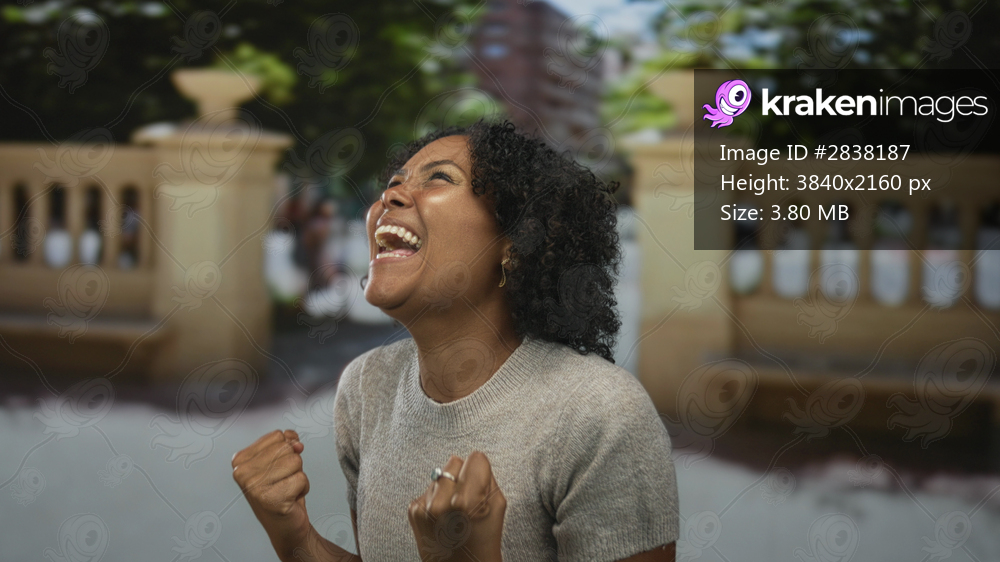 Woman clenches fists and smiles broadly in front of stone building on busy street under sunlight; excitement.