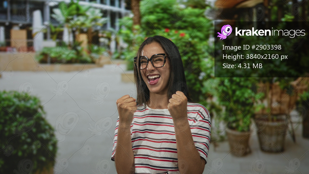 Woman clenches fists and smiles with glasses and striped shirt on a city street with potted plants and stone walkway; joy.