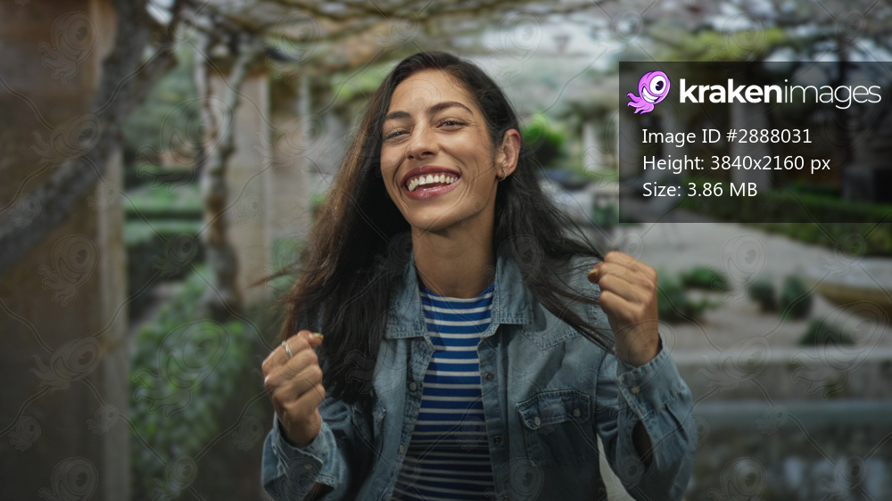 Woman clenches fists and smiles in building pergola courtyard, denim jacket and striped shirt visible; joy celebration.