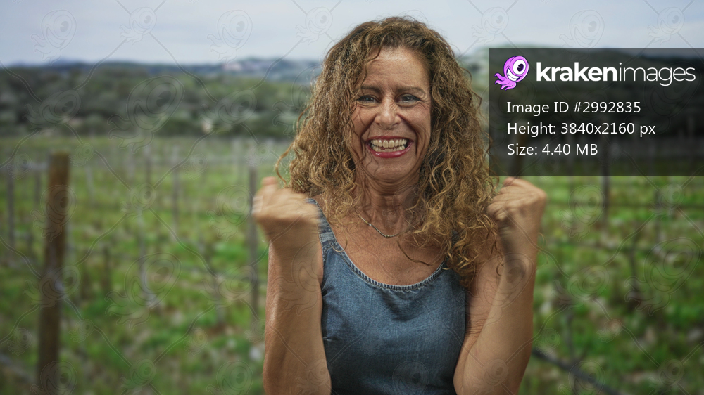 Woman clenches fists and smiles in denim dress amid a vineyard with wooden trellis in forest hills; joy triumph.