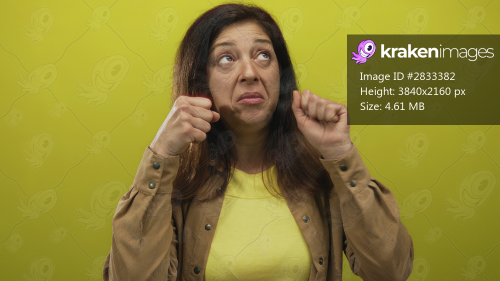 Woman clenching fists at face level and raising eyebrows toward the ceiling in a yellow studio setting; frustration.