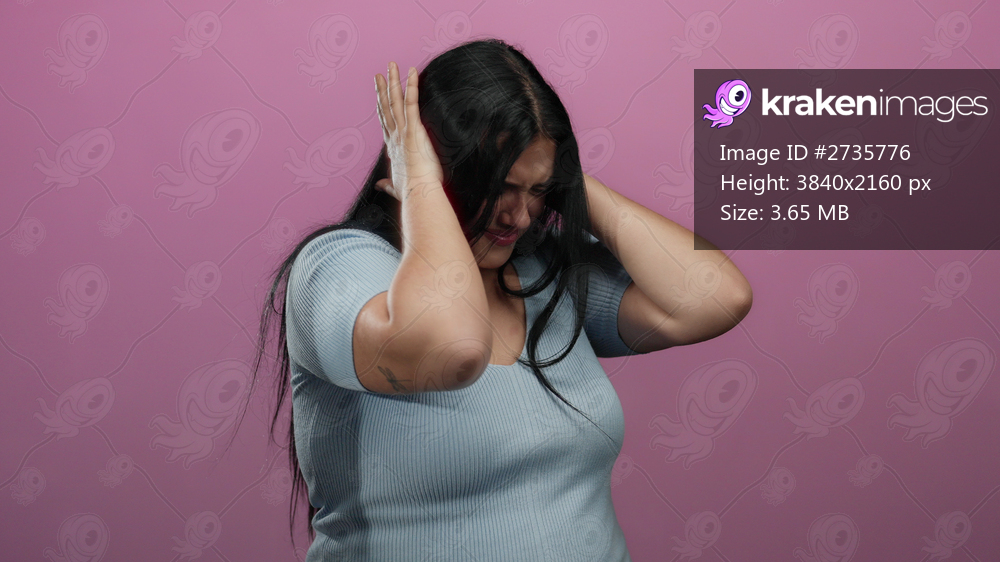 Woman with closed eyes covers ears in stress isolated against vibrant pink wall suggesting frustration or noise.
