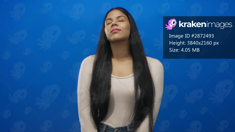 Woman with closed eyes, long dark hair cascading past shoulders tilts head back in blue studio; serenity.