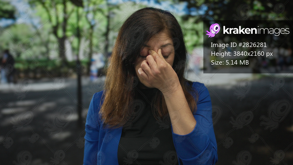 Woman with closed eyes pinches nose bridge with hand in forest setting among green trees and dappled sunlight; stress.