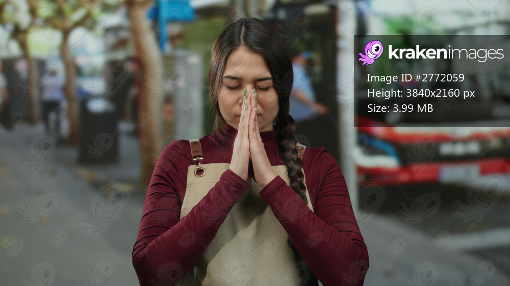 Woman with closed eyes praying outdoors in apron with braided hair standing on busy street in peaceful contemplation.