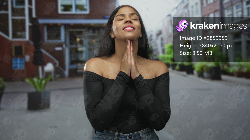 Woman with closed eyes presses hands for prayer on busy city street framed by brick buildings and potted plants; hope.