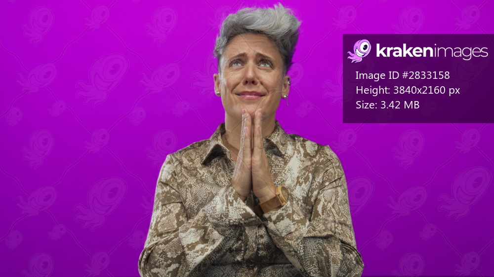 Woman with closed eyes and soft smile presses palms together in prayer gesture in purple studio; hope.