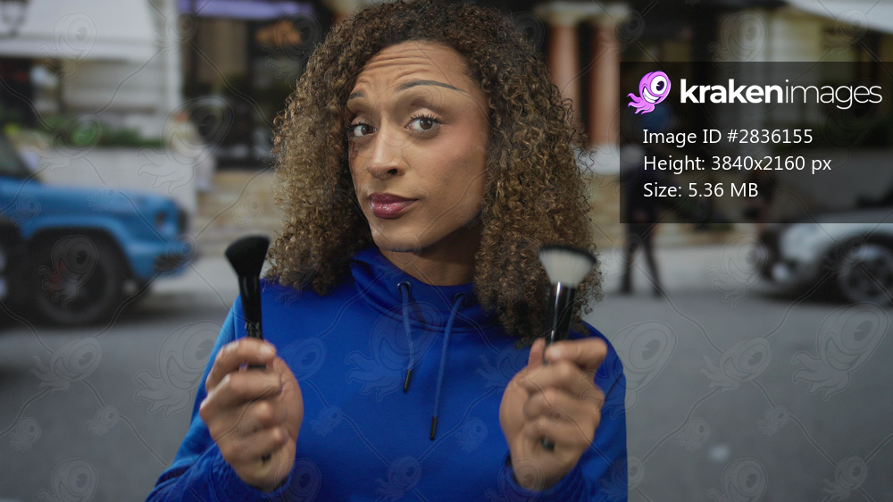 Woman closely examining two makeup brushes on street with a blurred building facade behind her; uncertainty.