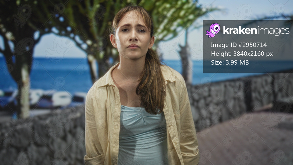 Woman closing eyes and lowering head on a seaside street with stone wall and palm trees, visible shoulder and upper chest; quiet melancholy.