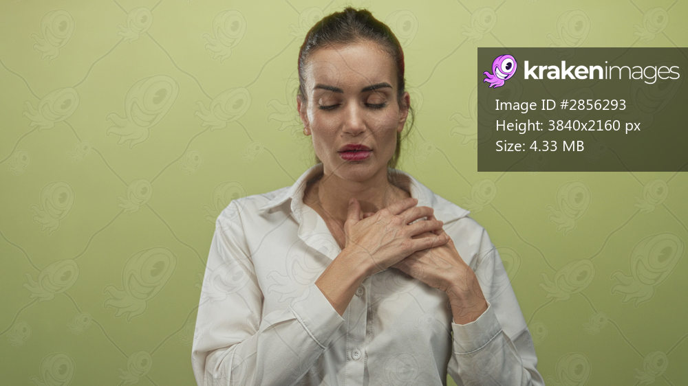 Woman clutch chest with both hands in green studio setting expressing heartattack from sudden chest pain; distress.