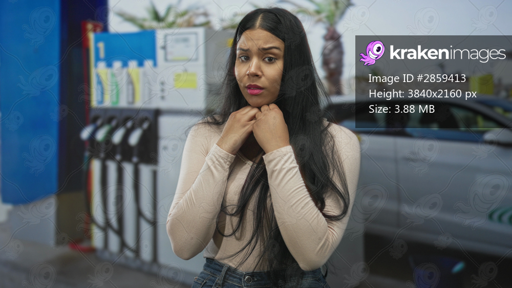 Woman clutch chest by petrol pump and white car at street with furrowed brow and tense posture; anxiety.