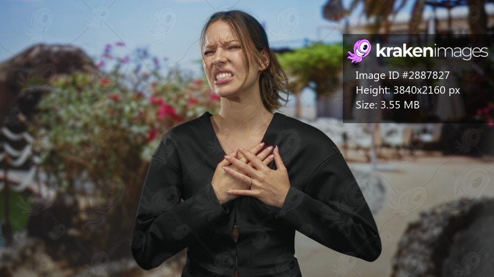 Woman clutch chest for heartattack in front of a building with patio umbrellas and flowering shrubs; panic.