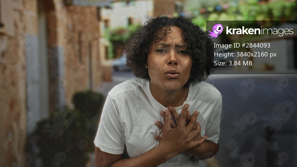 Woman clutch chest for heartattack on weathered cobblestone street in historic town district; anguish.