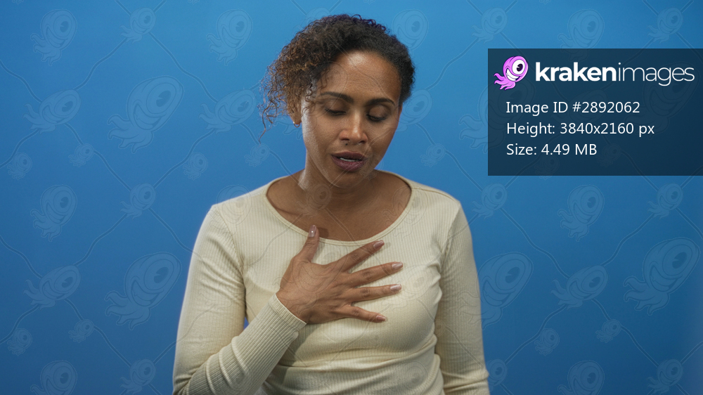Woman clutch chest with hand over heart and mouth open, eyes closed in bright blue studio wall; breathless concern recovery.