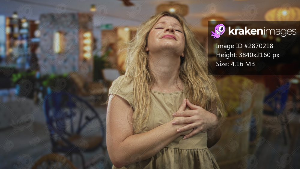 Woman clutch chest with hands in hotel building lobby, holding hands over heart and wincing with closed eyes; pain vulnerability.