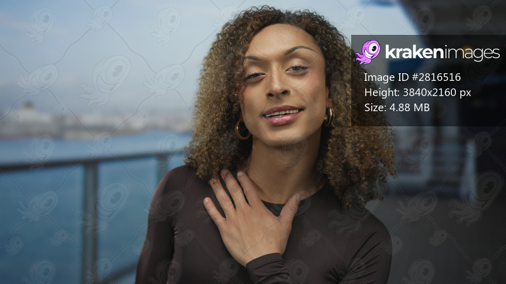 Woman clutch chest with head tilt and closed eyes outdoors on cruise deck overlooking water; serenity.
