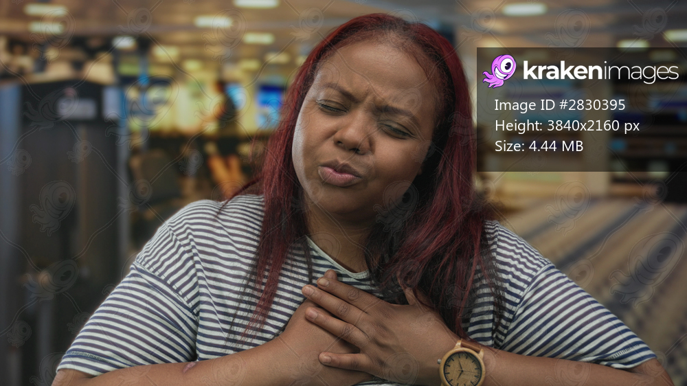 Woman clutch chest in indoor gym with blurred fitness equipment behind and striped shirt visible; pain heartattack distress discomfort.