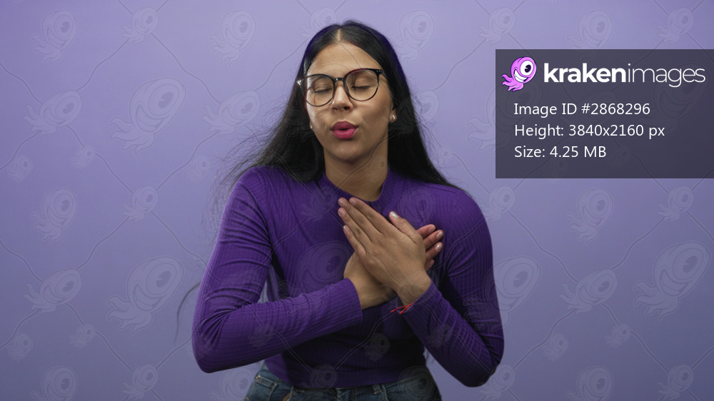 Woman clutch chest in purple studio with closed eyes and tense expression conveying heartattack gesture; anxiety.